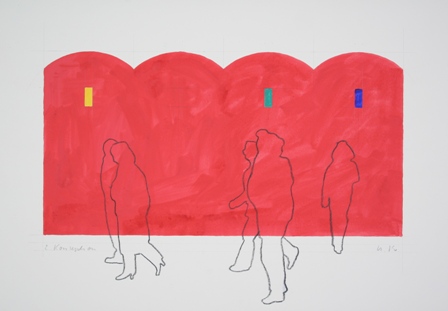 kommunikative Raum - 4 Orte in einer Stadt, 1985, 2. von 4 Entwürfen, Tempera und Zeichenkohle auf Karton, 43 x 61 cm |
